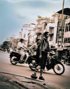 河內街上的小摩托真多,不亞於我到過的任何一個中國城市。每當亮起紅燈的時候,線後密密麻麻排著的摩托群頗為壯觀,男的、女的、老的、少的都在其中,女人更是用帽子、三角巾、墨鏡把自己蒙的嚴嚴實實,如果單看的話,很像懸念片裡的神秘女郎。男人也愛戴帽子,遮住精瘦的小臉。這些人組合在一起,很容易讓人對他們的目的地浮想聯翩,不知道他們要去的地方有什麼事情等著他們。